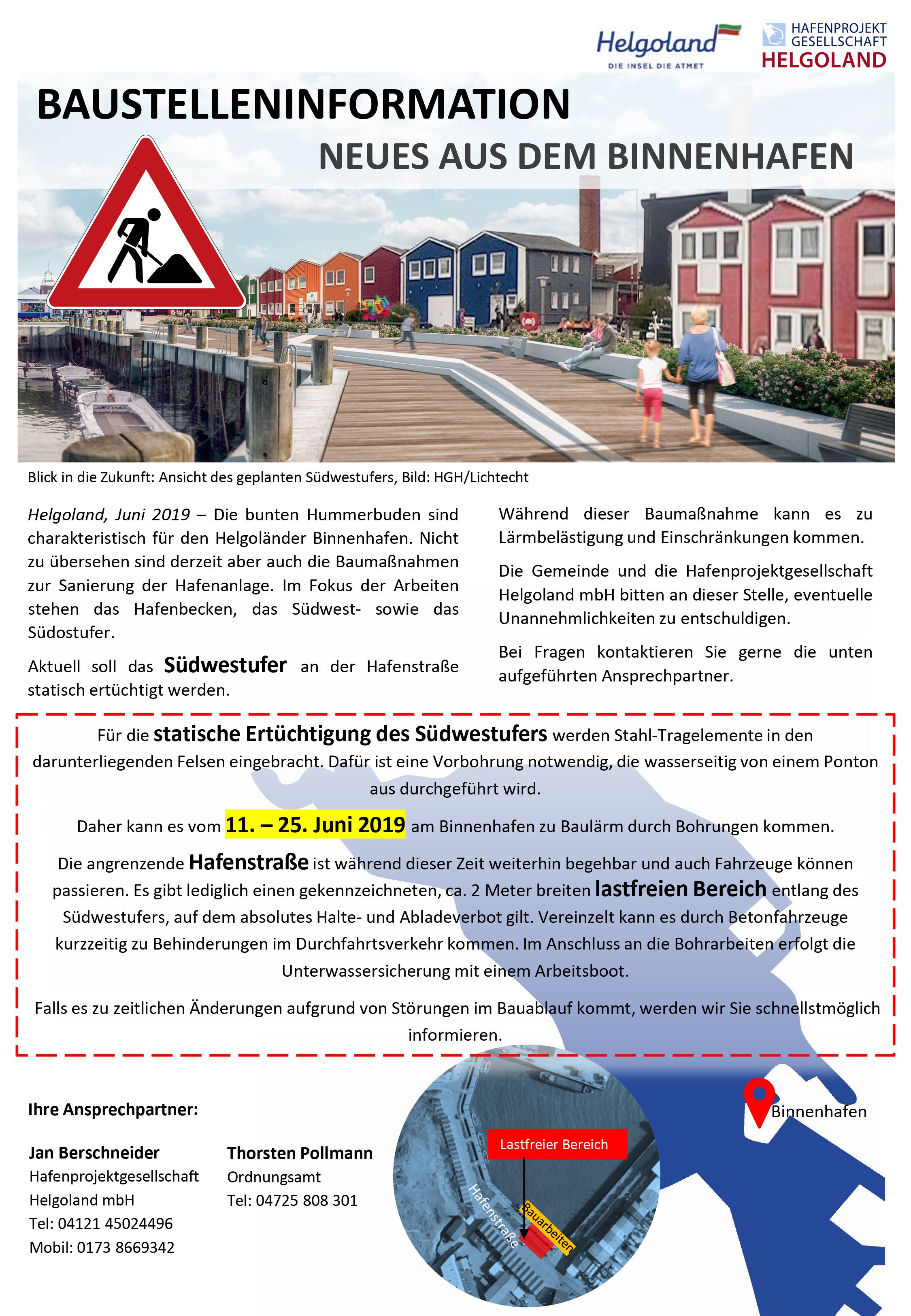 Baustelleninformation: Bohrung am Südwestufer von Ende Juli bis Anfang August 2019 Aktuell soll das Südwestufer im Binnenhafen an der Hafenstraße statisch ertüchtigt werden. ​Während dieser Baumaßnahme kann es zu Einschränkungen kommen.